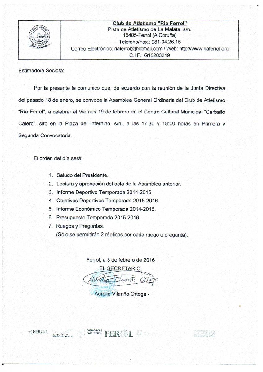 Ayer viernes 19 de Febrero, se celebró en el Centro Cultural Municipal "Carballo Calero", la ASAMBLEA GENERAL ORDINARIA DE SOCIOS del Club de Atletismo "Ría Ferrol.
